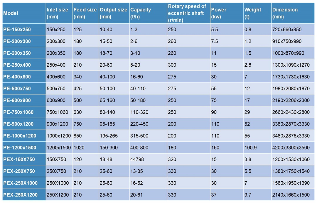 We have primary (Rough break) and secondary (Finely break) types of jaw crusher. Roughly broken is PE model, it has the features of large input and large output. Fine breaking is PEX model, it has the features of small input and small output.